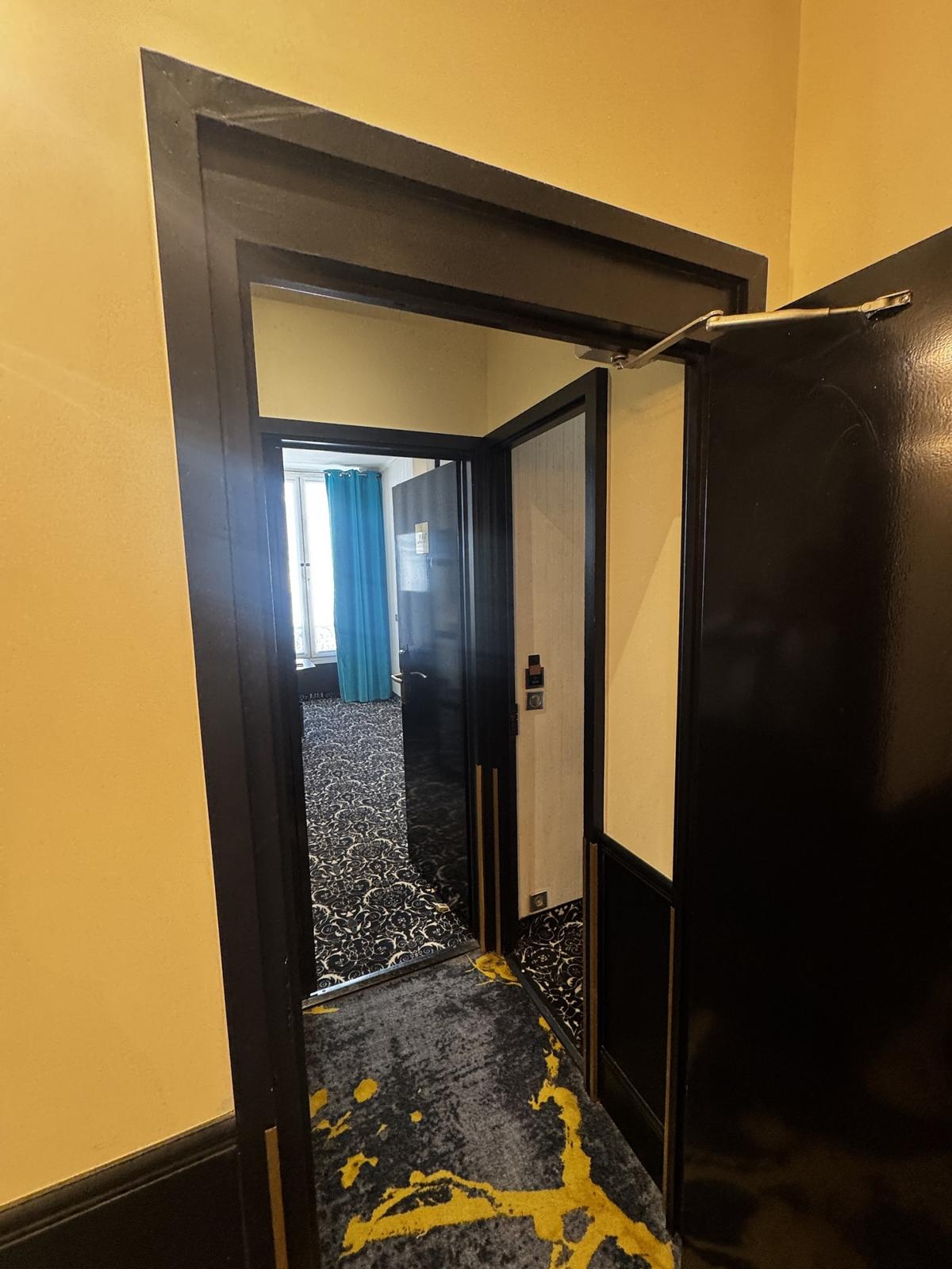 Номер состоит из двух отдельных комнат, объединённых общим входом: через одну дверь вы попадаете в небольшой приватный коридор, из которого ведёт доступ в каждую комнату. Такая планировка позволяет сохранить личное пространство, оставаясь рядом друг с другом.
